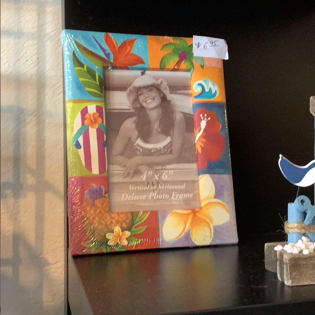 A photo frame with ocean/beach themed items